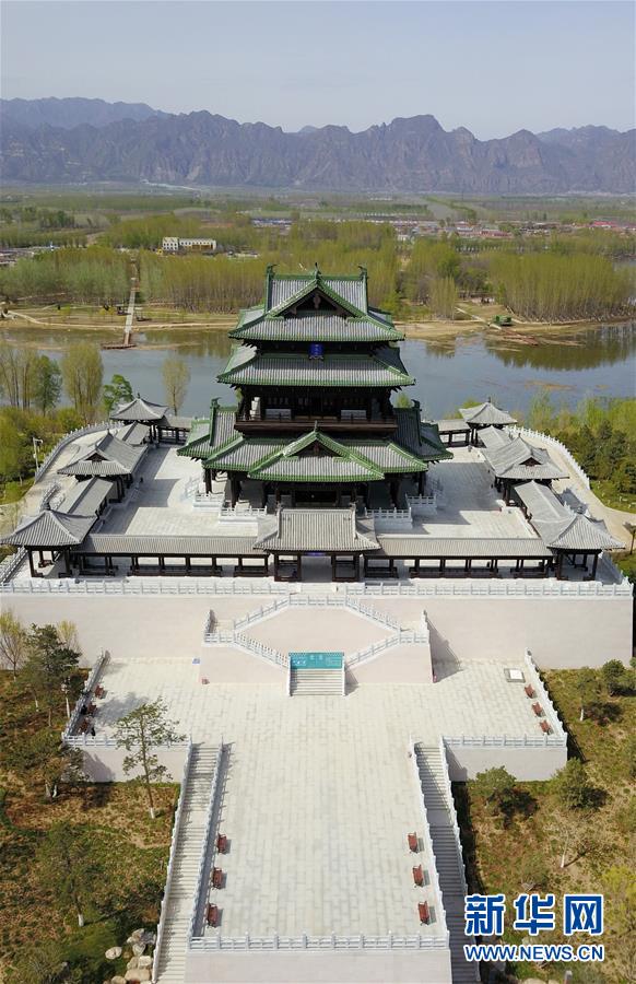 4月18日无人机拍摄的永宁阁。 随着2019北京世园会临近开幕,世园会园区内的主要建筑已全面完工。群山脚下、妫水之畔,从白天到夜晚,世园会园区仿佛一幅多彩画卷,向世人徐徐展开。 新华社记者 陈晔华 摄