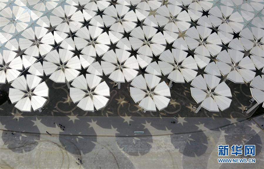 4月18日无人机拍摄的国际馆顶部。 随着2019北京世园会临近开幕,世园会园区内的主要建筑已全面完工。群山脚下、妫水之畔,从白天到夜晚,世园会园区仿佛一幅多彩画卷,向世人徐徐展开。 新华社记者 陈晔华 摄