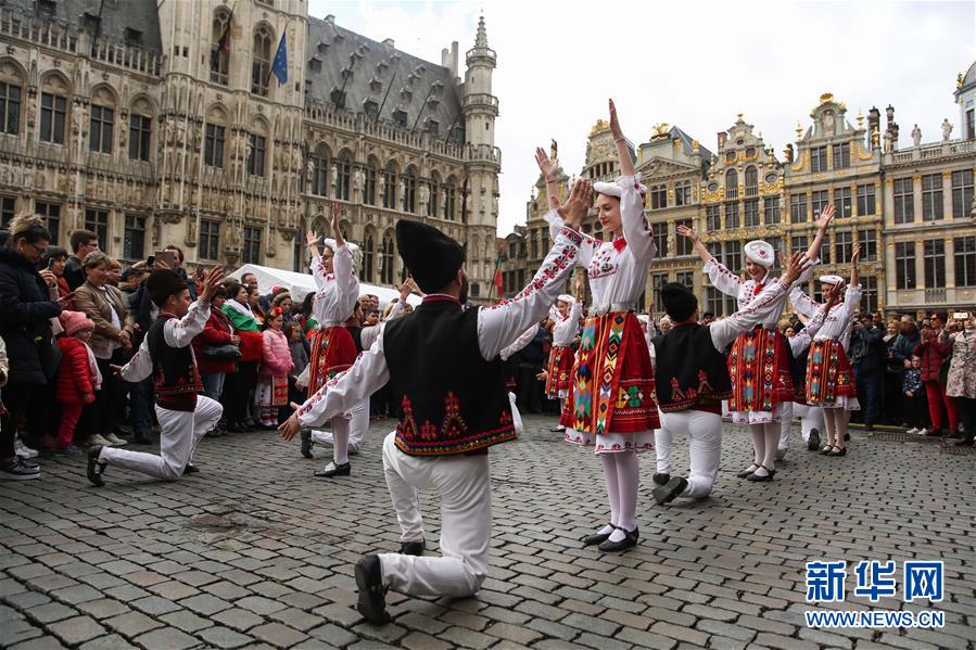 4月28日,在比利时布鲁塞尔大广场,演员表演保加利亚的民族舞蹈。 当日,来自欧洲多个国家的表演者在比利时布鲁塞尔大广场载歌载舞,庆祝为期五天的2019年巴尔干文化艺术节圆满落幕。该文化艺术节旨在用音乐、舞蹈、文学、街头艺术等方式向公众展现东南欧巴尔干半岛地区的民族文化风情。 新华社记者郑焕松摄