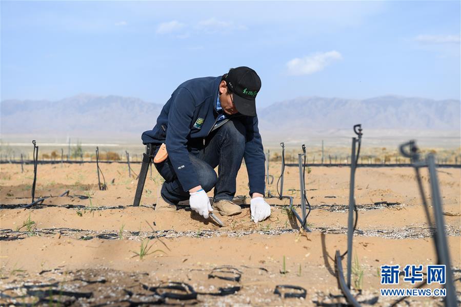 5月1日,在阿拉善左旗腾格里沙漠东缘,吴向荣在育苗地观察植物发芽情况。新华社记者 刘磊 摄