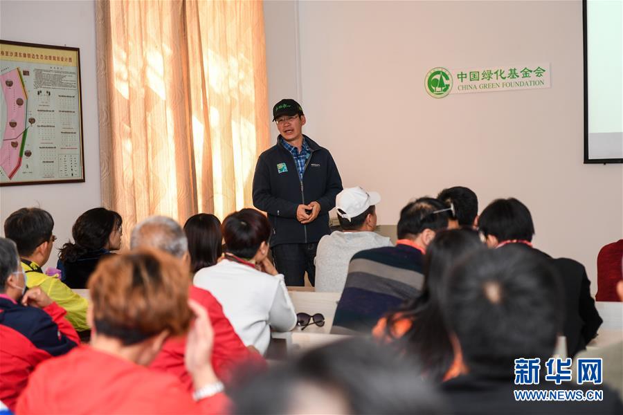 5月2日,在阿拉善左旗腾格里沙漠东缘的办公区,吴向荣在给前来治沙的志愿者讲课。新华社记者 刘磊 摄