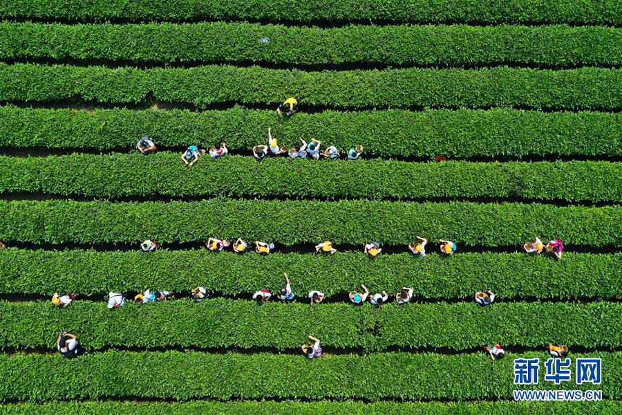 4月25日,小学生在定心茶园标准化茶叶基地内体验春茶采摘(无人机拍摄)。新华社记者 王全超 摄