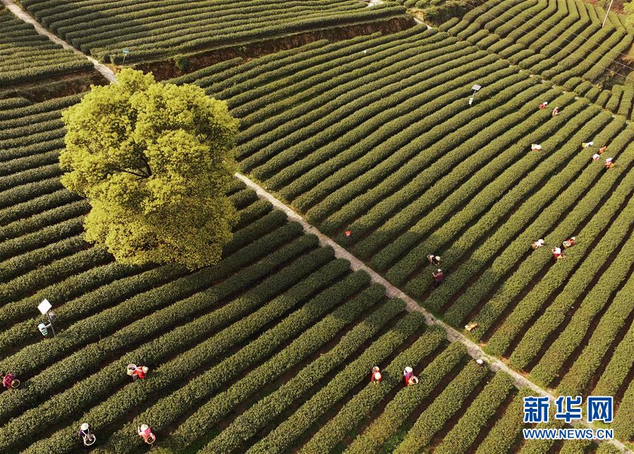 3月18日,茶农在定心茶园标准化茶叶基地内采摘春茶(无人机拍摄)。新华社记者 王全超 摄