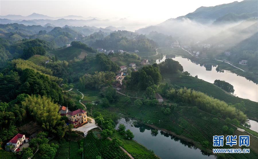 5月3日无人机拍摄的金寨县油坊店乡的茶园与农舍。