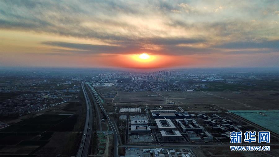 3月31日无人机拍摄的雄安新区市民服务中心(前)远处为容城县城区。新华社记者牟宇摄