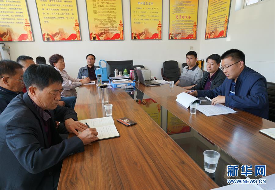 鲁昊(右一)在新庄窠村党支部支委会上发言(4月30日摄)。 新华社记者 牟宇 摄