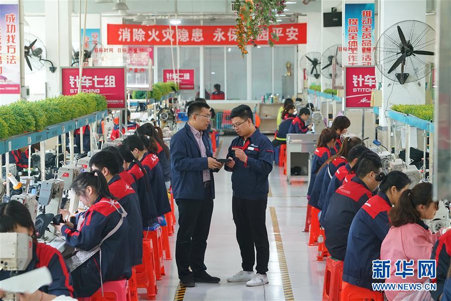 鲁昊(中左)在三台镇一家制鞋企业调研(5月1日摄)。 新华社记者 牟宇 摄