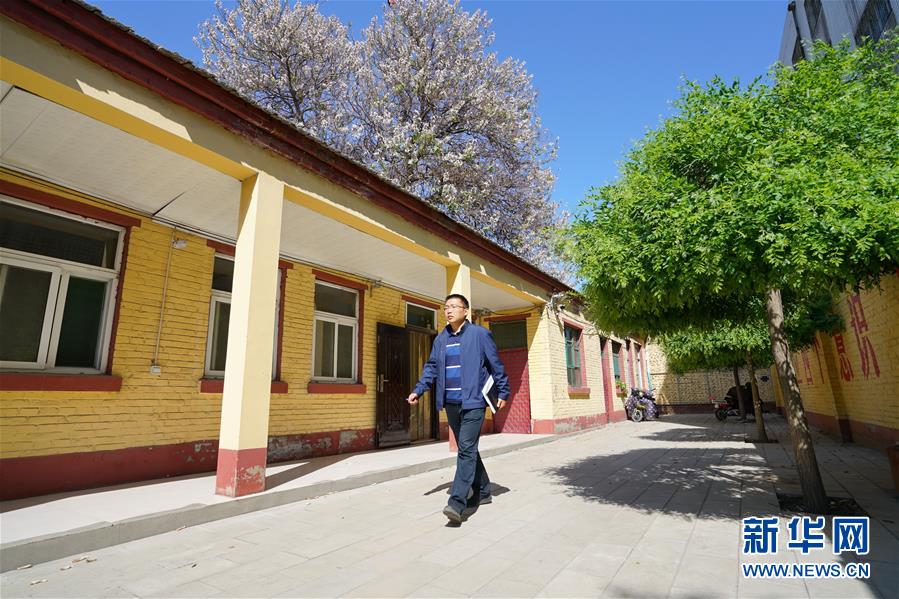 鲁昊走出宿舍,去新庄窠村开会(4月30日摄)。 新华社记者 牟宇 摄