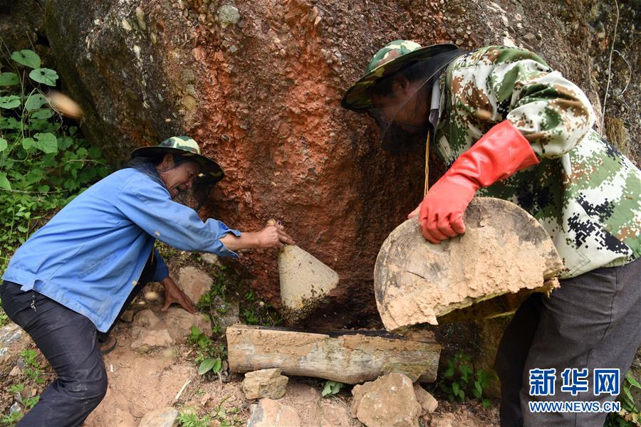 5月10日,在甘肃省陇南市徽县大河店镇硬湾村,蜂农李成(左)和刘辉林在收蜂。 甘肃省陇南市徽县大河店镇硬湾村位于秦巴山区深处,2017年,在当地政府的扶持下,龙崖老巢蜜养殖农民专业合作社成立,蜂农们将传统养蜂技艺和现代加工方式相结合,并通过电商等渠道打开销路,有效带动了当地贫困村民脱贫致富。目前整个合作社共有蜂箱2000余个,每箱每年可带来三四千元的收入。 新华社记者 马宁 摄