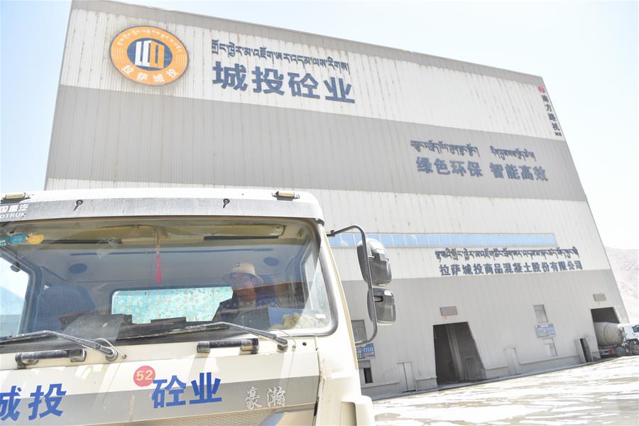 西藏拉萨市城关区蔡公堂乡蔡村的拉萨城投商砼站院内,一辆水泥罐车在车间门口排队等候装车(5月8日摄)。新华社记者 周锦帅 摄