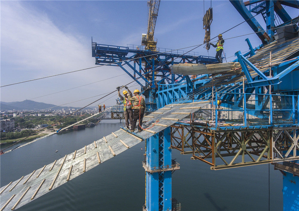 2019年5月10日,湖北襄阳,在庞公大桥施工现场,工人接收塔吊运送的施工材料。