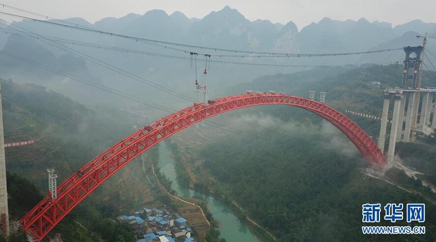 9月12日使用无人机拍摄的大小井特大桥。目前,横跨在贵州省罗甸县大井河上的大小井特大桥建设进入冲刺阶段。大小井特大桥全长1.5公里,主跨450米,是世界最大跨径上承式钢管混凝土拱桥。据了解,该桥是平塘至罗甸高速公路关键性工程,对打通贵州“断头路”,助推滇黔桂石漠化片区脱贫攻坚具有重要意义。新华社记者刘续摄