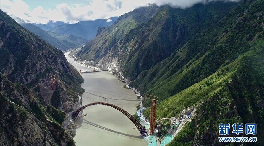 9月28日无人机拍摄的川藏铁路拉林段重点标志性工程藏木特大桥。当日,随着最后一节钢管拱的对位和锁定完毕,川藏铁路拉林段藏木特大桥成功合龙,标志着大桥主体结构施工取得了关键性胜利。藏木特大桥由中国中铁广州局集团承建,拱高112米,桥横跨雅鲁藏布江峡谷,水深66米。新华社记者普布扎西摄