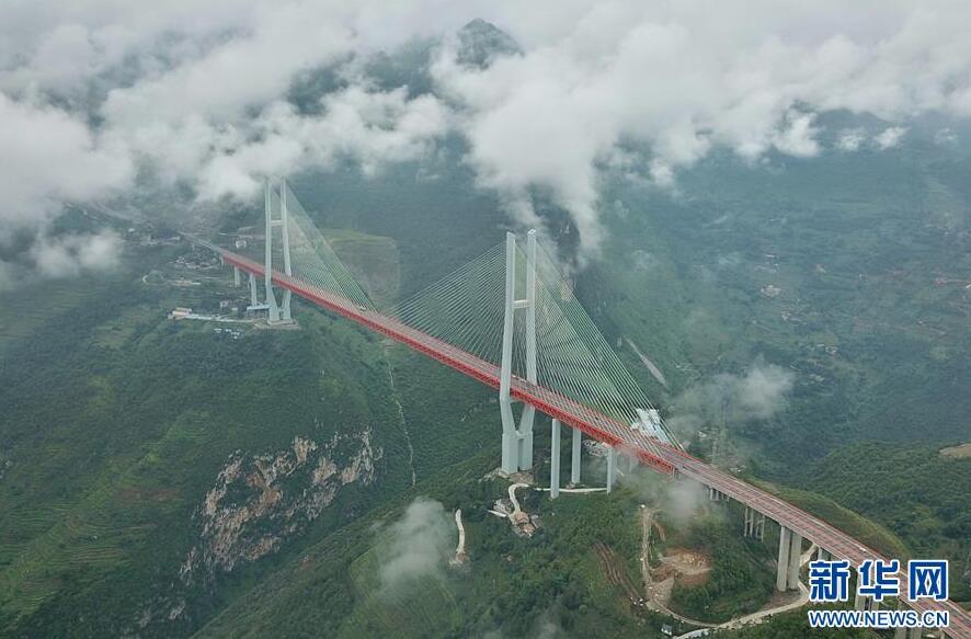 当日,杭瑞高速贵州省毕节至都格(黔滇界)公路北盘江大桥上云雾缭绕,美景如画。北盘江大桥主桥跨径720米,桥面到谷底垂直高度565米。