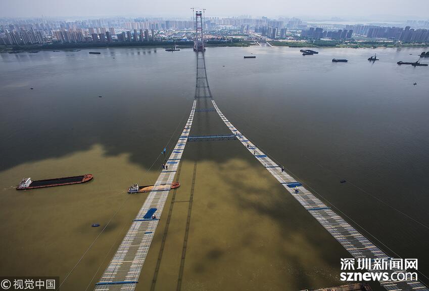 2018年5月14日,武汉,武汉杨泗港长江大桥上空,上部结构施工进入猫道面网铺设阶段,数十名中铁大桥局工人在跨江高空拼搏赶超,江面上空的临时“吊桥”悄然形成。数十名工人在长江上空228米处拼搏赶超,临时“天梯”悄然形成。