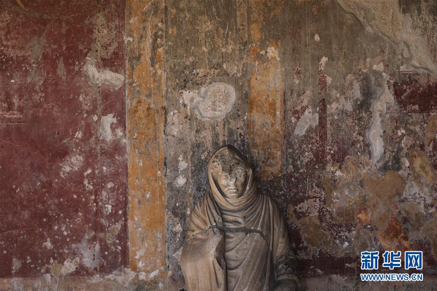 这是4月30日在意大利庞贝古城拍摄的一处雕塑。