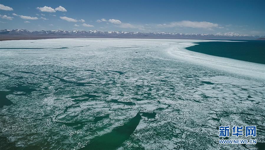 5月8日无人机拍摄的西藏纳木错开湖画面。
