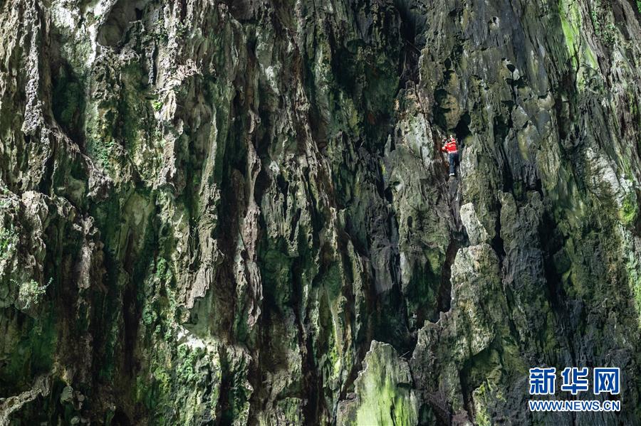 在贵州省安顺市格凸河景区,“蜘蛛人”罗登萍表演徒手攀岩(4月19日摄)。
