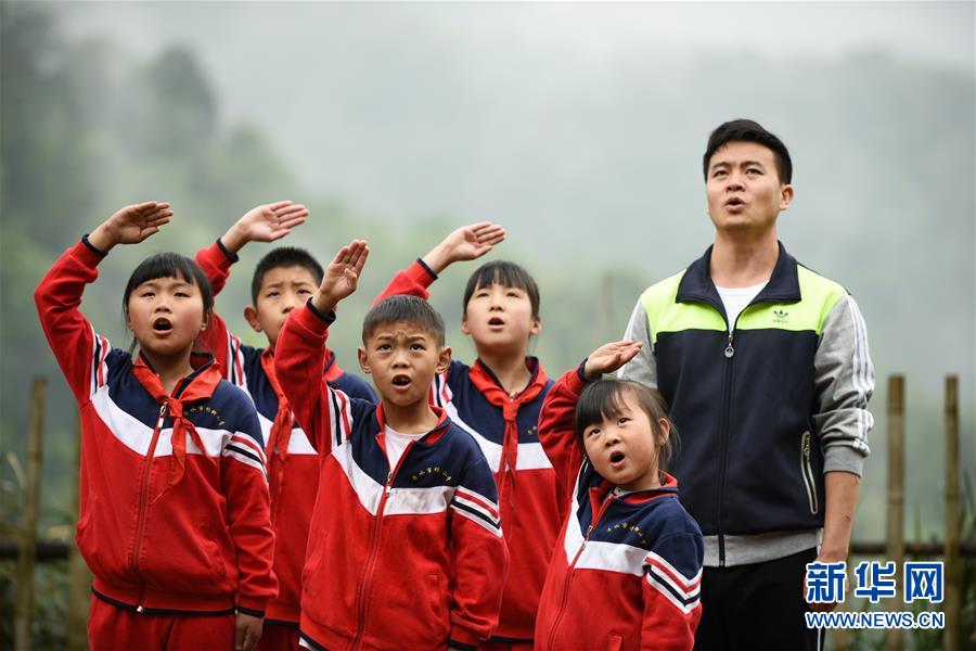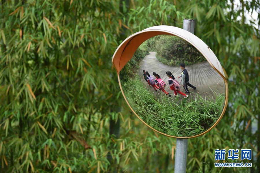 5月9日,周正文(右一)护送放学的学生回家。 周正文是地处大山深处的贵州省赤水市长沙镇长兴村杨柳小学的一名教师。