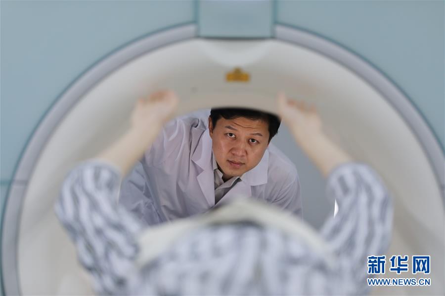 在中科院武汉物理与数学研究所波谱与原子分子物理国家重点实验室,周欣在人体成像仪前检查受试患者准备情况(4月18日摄)。 2009年,周欣放弃美国优渥条件回国工作,一个人开始设计制作人体肺部气体磁共振成像仪器。