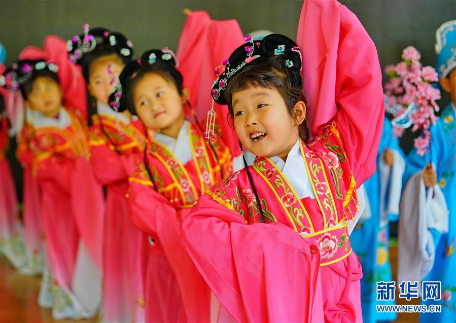 5月14日,滦南县第二幼儿园的孩子们在学习评剧。 近年来,河北省滦南县在全县中小学、幼儿园开设评剧、皮影戏和乐亭大鼓等非遗课程,并定期组织专业演艺人员走进学校进行培训指导,培养学生对传统文化的兴趣。 新华社记者 杨世尧 摄