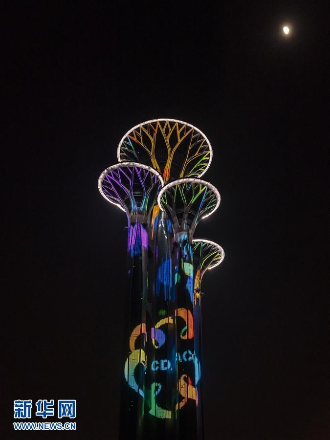 5月14日,国家会议中心和奥林匹克塔交相辉映。 当晚,一场“空间光影秀”在北京上演。 新华社记者 李贺 摄