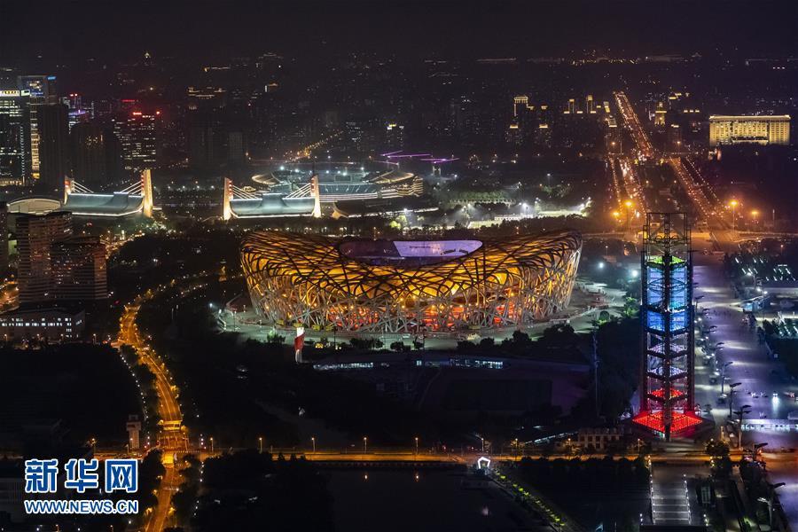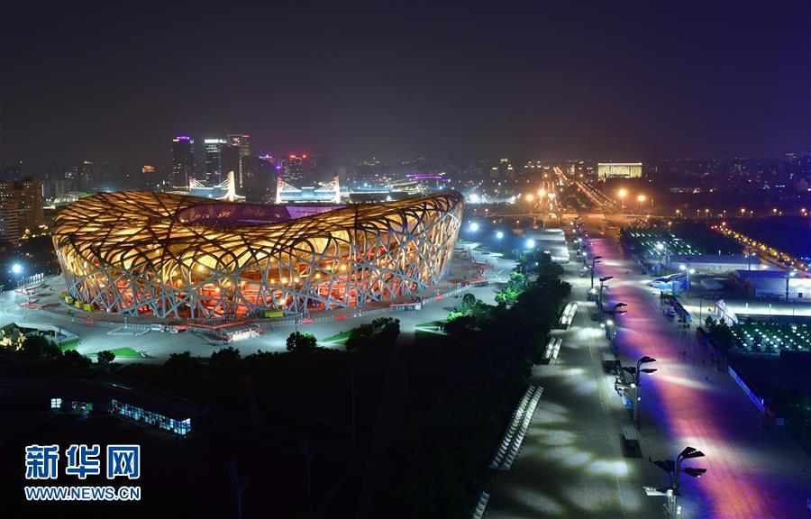“鸟巢”灯光璀璨(5月14日摄)。 当晚,一场“空间光影秀”在北京上演。 新华社记者 沈伯韩 摄