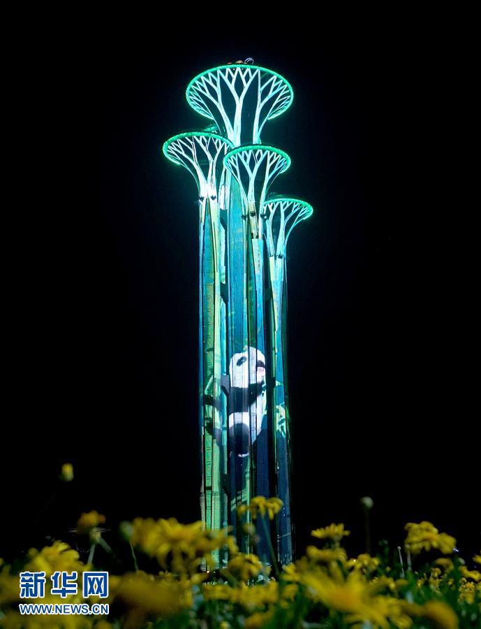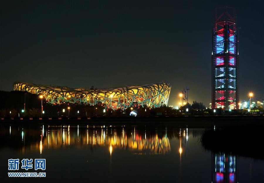 “鸟巢”和玲珑塔交相辉映(5月14日摄)。 当晚,一场“空间光影秀”在北京上演。 新华社记者 陈建力 摄