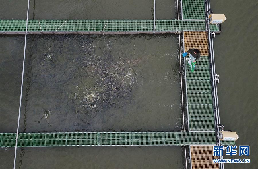 5月15日,在南浔区菱湖镇盛江家庭农场,农场主盛素红将饲料倒入“跑道”中(无人机拍摄)。 近年来,浙江省湖州市南浔区积极推广“跑道养鱼”模式,推动渔业养殖业转型升级,取得良好生态效益和经济效益。 据了解,“跑道养鱼”是一种池塘内循环养殖模式,将传统养殖池塘进行改造,利用池塘面积的5%左右建设循环流水养殖水槽进行高密度养殖,其余池塘面积对养殖尾水进行净化处理,实现养殖尾水“零排放”或达标排放。同时,池塘“跑道”中水体一直保持流动,鱼儿保持逆流游泳的姿态,在静水池塘中实现流水养鱼的效果。 新华社记者 黄宗治 摄