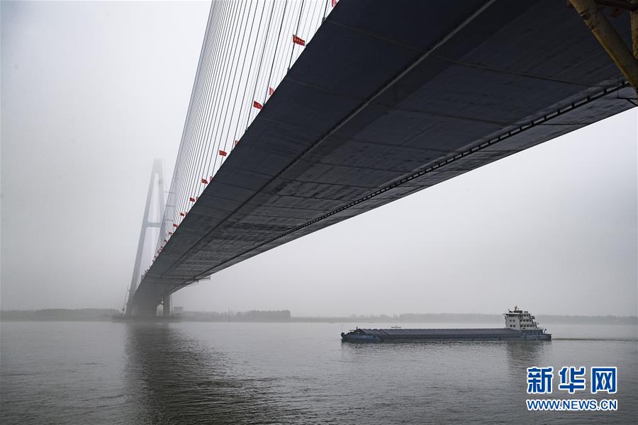 5月16日,一艘货船从武汉青山长江大桥下驶过。 当日,随着现场工人完成最后一段钢箱梁的焊接,武汉青山长江大桥实现合龙。 作为武汉四环线的重要控制性工程,武汉青山长江公路大桥全长7548米,主跨938米,桥宽48米,为目前跨越长江桥面最宽的桥梁。大桥建成后,对于优化武汉“环线+射线”路网结构、打造中部地区现代物流基地等都具有重要意义。 新华社记者 肖艺九 摄