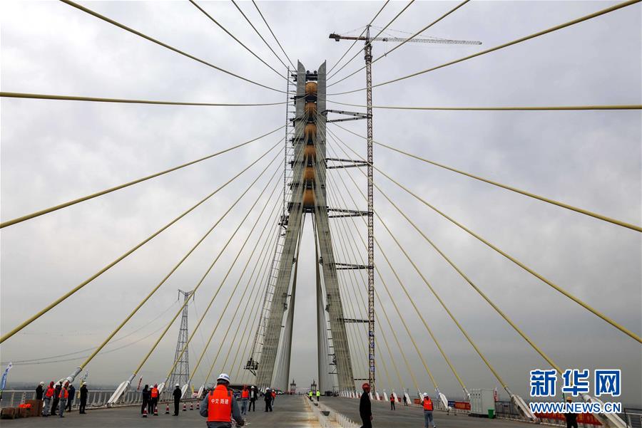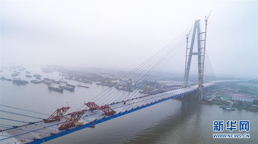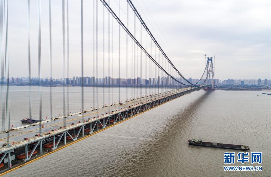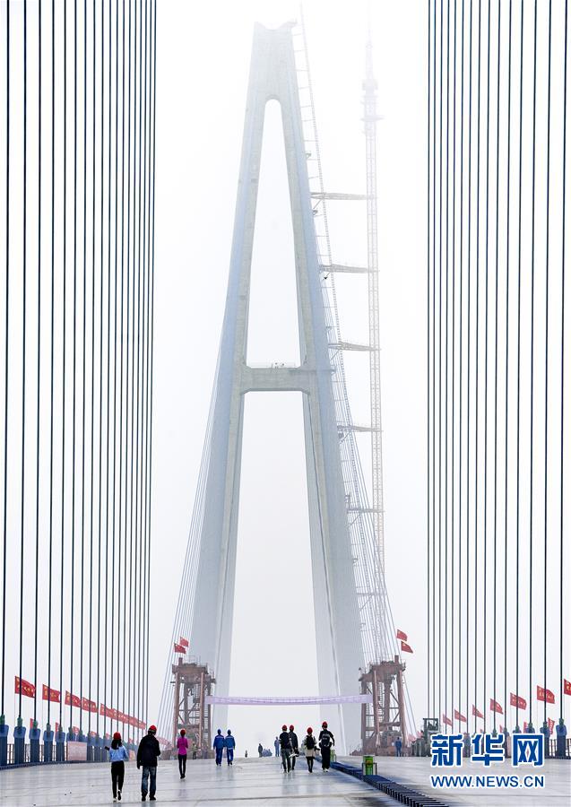 当日,随着最后一节钢梁吊装到位,由中铁大桥院设计、中铁大桥局施工的武汉杨泗港长江大桥顺利合龙,标志着这座世界最大跨度双层公路悬索桥主体工程完工,进入桥面铺装阶段。 武汉杨泗港长江大桥是武汉市内建设的第十座长江大桥,也是长江上首座双层公路大桥。 新华社记者 肖艺九 摄
