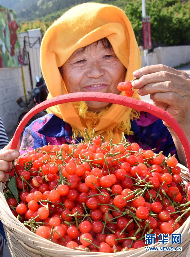 5月16日,一位果农在介绍自家的樱桃。 近日,青岛市城阳区夏庄樱桃谷的6000余亩樱桃喜获丰收,由于樱桃挂果和保存周期短,当地推出“爱心助农乡村游”樱桃山会活动,吸引众多市民和游客前来踏青、采摘。 新华社记者 李紫恒 摄