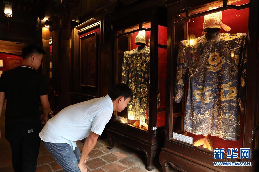 5月15日,在越南首都河内,人们在文庙-国子监内参观展出的古代文官和进士礼服。新华社记者王迪摄
