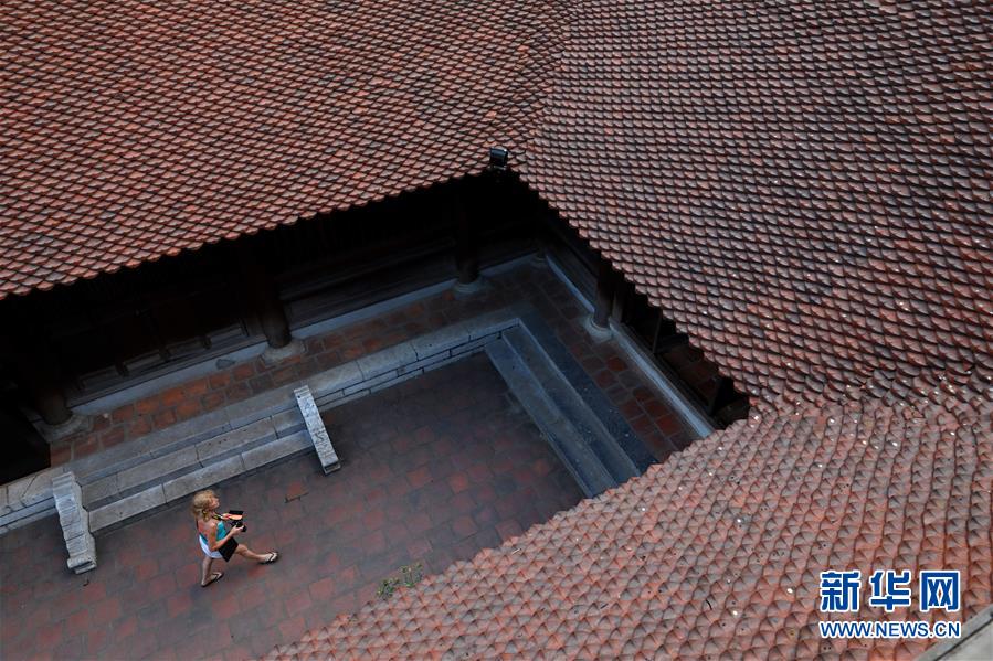 5月15日,一名游客从越南河内文庙-国子监的庭院中走过。新华社记者王迪摄