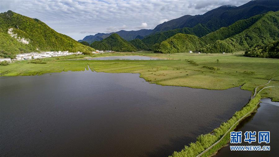 神农架大九湖高山湿地风光(5月16日无人机拍摄)。 在“华中屋脊”湖北神农架深处有一片高山湿地,一条小溪串起9个湖泊,故名“大九湖”。这里群山环绕,风光秀丽,宛如世外桃源。 新华社记者 董江辉 摄