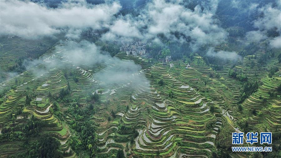 4月16日无人机拍摄的堂安梯田。 谷雨将至,贵州省黔东南苗族侗族自治州黎平县堂安梯田云蒸雾绕,美景如画。 新华社记者欧东衢摄