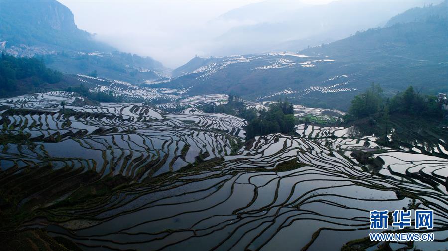 这是在云南省元阳县拍摄的晨曦中的哈尼梯田美景(4月4日无人机拍摄)。哈尼梯田位于云南省哀牢山南部,以哈尼族为主的当地群众千百年来生生不息在大地上“雕刻”出这一农耕文明奇观。春日里,漫山的水稻梯田与云海、森林、村庄形成一幅美丽的画卷,吸引众多海内外游客前来观赏。新华社记者 胡超 摄