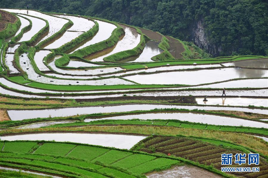 5月18日,农民从贵州省丹寨县龙泉镇高要梯田里走过。 初夏时节,位于贵州省丹寨县龙泉镇的高要梯田景色优美。 新华社记者 杨文斌 摄