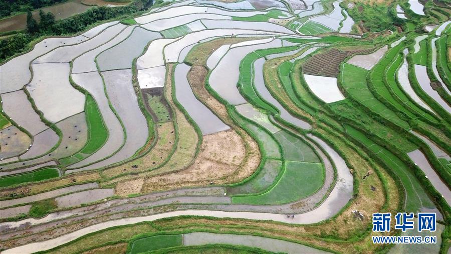 5月18日,农民在贵州省丹寨县龙泉镇高要梯田里耕作(无人机拍摄)。 初夏时节,位于贵州省丹寨县龙泉镇的高要梯田景色优美。 新华社记者 杨文斌 摄