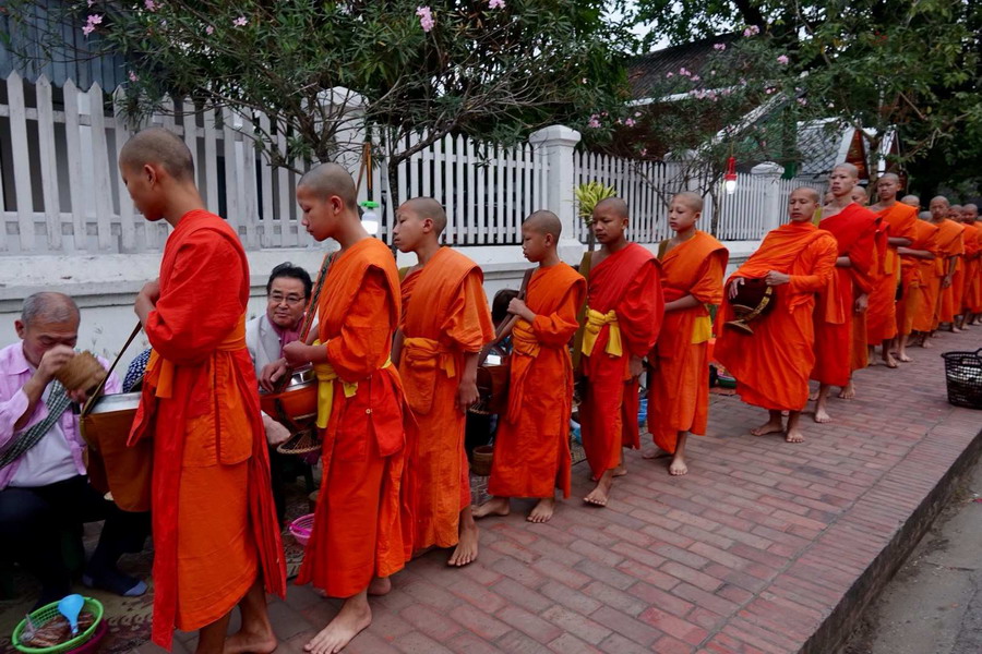 每天清晨,虔诚的佛教徒备好花塔和糯米饭,跪坐在街道两旁,等候僧侣前来化缘,然后将糯米饭和粽子放到他们的化缘钵中,僧侣则以诵经祈福答谢施主。