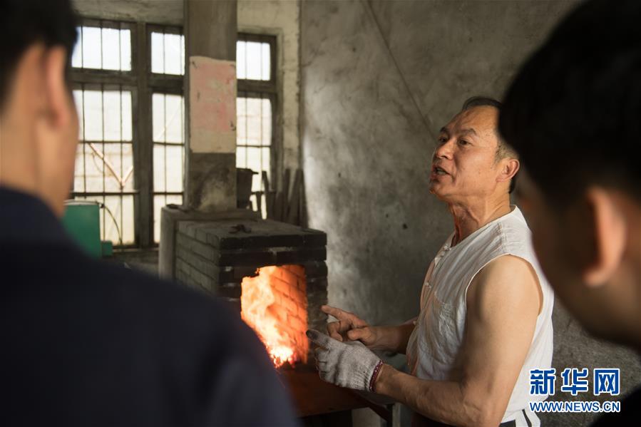 5月21日,郑国荣在“古越剑铺”向徒弟们传授宝剑淬火技艺。 新华社记者 翁忻旸 摄