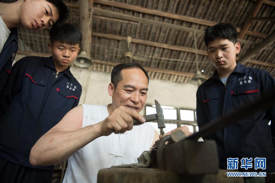 5月21日,郑国荣在一把宝剑上錾刻龙凤纹,徒弟们在旁边学习。 新华社记者 翁忻旸 摄