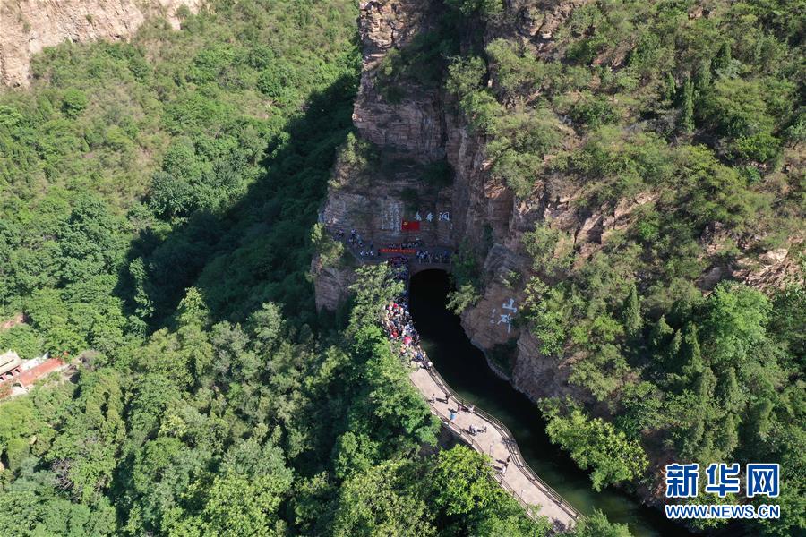 5月22日,游客在河南林州红旗渠畔参观(无人机拍摄)。巍巍太行绝壁,一渠清水蜿蜒。20世纪60年代,河南林州人民历经十年奋战,在太行山的悬崖绝壁之间建成了全长1500公里的大型引水灌溉工程——红旗渠。如今,每年有数十万游客前来参观游览红旗渠风景区,感悟红旗渠精神。2017年,红旗渠入选《全国红色旅游经典景区名录》。新华社记者冯大鹏摄