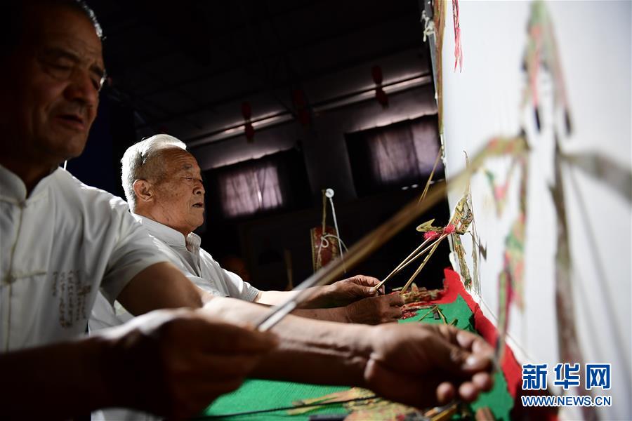 5月23日,华州皮影艺人刘华(右)在华州国际皮影艺术馆表演。陕西省渭南市华州区是皮影戏艺术重要源头之一。2006年,皮影戏被列入首批国家级非物质文化遗产保护名录。传统华州皮影制作选用上等牛皮为原料,经过刮、磨、洗、刻、染等24道工序精工细作,一件成品需要刻三四千刀才能做成。传统华州皮影戏由5个人来操纵皮影及多种乐器来表演。如今,华州皮影在保护传统的同时进行改良和创新。华州皮影艺人薛宏权在皮影制作中引入工笔画手法,开发出皮影摆件、挂件、首饰等文创产品,在皮影戏剧目内容编排上,开发出皮影芭蕾舞、皮影迈克尔·杰克逊等全新的表演内容,使乡土气息浓郁的皮影戏变得时尚现代。新华社记者李一博摄
