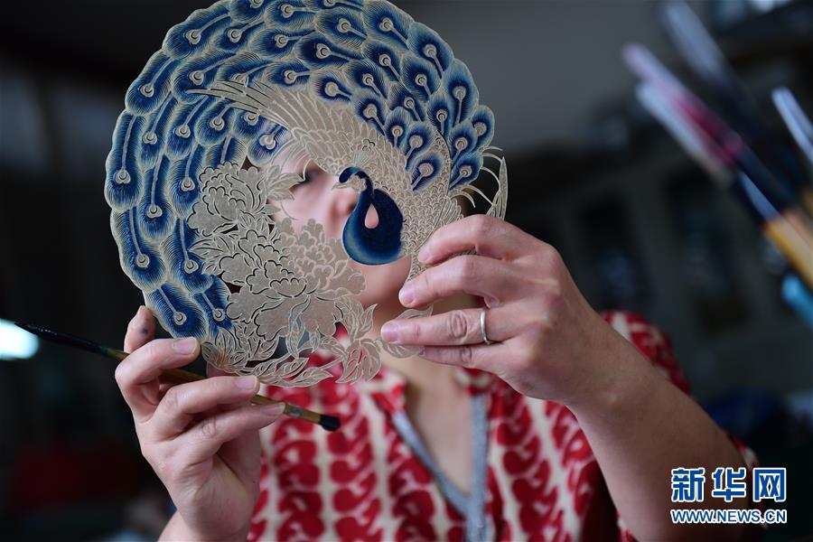 5月23日,华州影子坊皮影制作工人为皮影上色。陕西省渭南市华州区是皮影戏艺术重要源头之一。2006年,皮影戏被列入首批国家级非物质文化遗产保护名录。传统华州皮影制作选用上等牛皮为原料,经过刮、磨、洗、刻、染等24道工序精工细作,一件成品需要刻三四千刀才能做成。传统华州皮影戏由5个人来操纵皮影及多种乐器来表演。如今,华州皮影在保护传统的同时进行改良和创新。华州皮影艺人薛宏权在皮影制作中引入工笔画手法,开发出皮影摆件、挂件、首饰等文创产品,在皮影戏剧目内容编排上,开发出皮影芭蕾舞、皮影迈克尔·杰克逊等全新的表演内容,使乡土气息浓郁的皮影戏变得时尚现代。新华社记者李一博摄