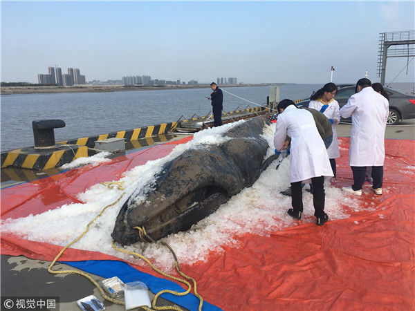 2017年11月15日中午,江苏启东海域浅滩,三次搁浅三次救援,座头鲸未能重返大海,确认死亡。13日、14日两天内,曾两次搁浅的鲸鱼在警民的救援引导下回到海中。图为鲸鱼尸体被吊车吊上岸。