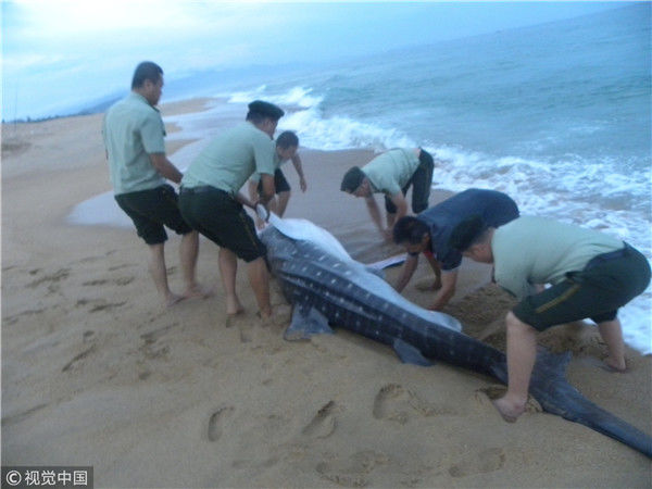 2017年6月20日,海南公安边防总队陵水边防支队黎安边防派出所官兵闻警而动,连同辖区渔民群众,及时对一只搁浅的幼年鲸鲨进行救助,助其回归大海。