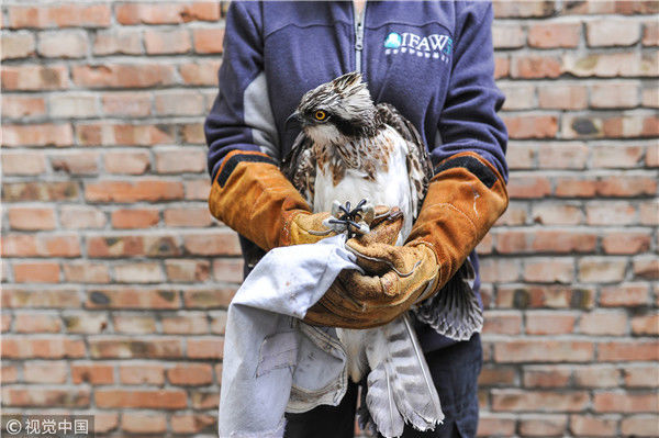 2016年10月18日,在北京猛禽救助中心,康复师抱着一只前一个礼拜救助的鹗准备观察它的飞翔能力,这是中心成立15年来救助的第一只鹗。这种猛禽被民间称为鱼鹰。