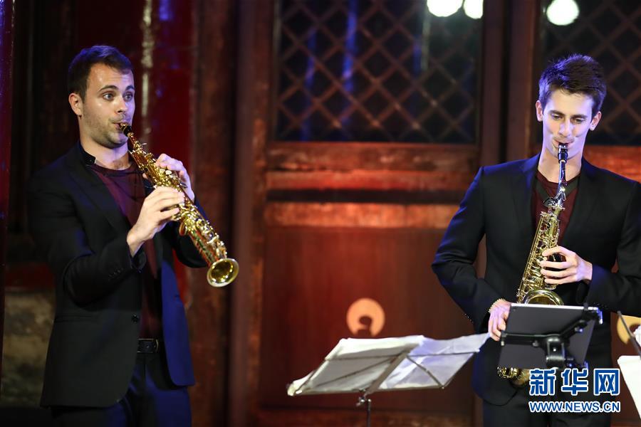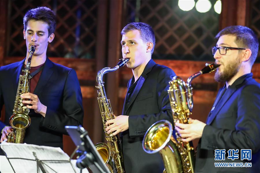 5月26日,凯比亚特乐队成员在音乐会上表演。 当日,作为第十九届“相约北京”艺术节系列演出之一,西班牙凯比亚特乐队萨克斯四重奏音乐会在北京Temple东景缘上演。 新华社记者 张玉薇 摄