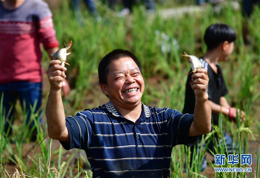 10月28日,在广西融水苗族自治县拱洞乡龙令村,村民参加抓鱼比赛。当日,广西融水苗族自治县拱洞乡举办香糯泉水螺美食文化节,苗族、侗族、瑶族、壮族等各民族同胞欢聚一堂,通过摸螺抓鱼比赛、田螺姑娘评选、跳芦笙踩堂舞、品香螺百家宴等丰富多彩的活动,庆祝金秋丰收。近年来,拱洞乡依托生态资源优势,大力发展香糯种植、田螺养殖等特色产业。全乡的田螺养殖面积4000多亩,成立4家田螺产业专业合作社,带动2000多农户参与到田螺养殖。目前,田螺养殖已成为当地贫困户脱贫致富的重要产业。新华社记者 黄孝邦 摄